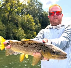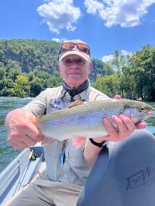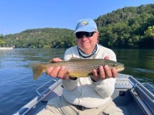 As we started fishing, we encountered high flows in the White River, ranging from 17,000 to 20,000 cfs for most of the trip due to heavy rains the prior week. The best fishing is found when the flows are about half this level. We were still able to land several decent-sized trout each day, throwing nymphs like the Girdle Bug and some smaller patterns. The technique for catching the largest fish was to pound the banks with large hopper patterns, such as Fat Alberts, to simulate cicadas falling from the trees along the banks. For those willing to commit to the effort and endure long unproductive stretches, rewards of larger trout resulted. Lodge guest Ryan landed several fine specimens employing this technique.