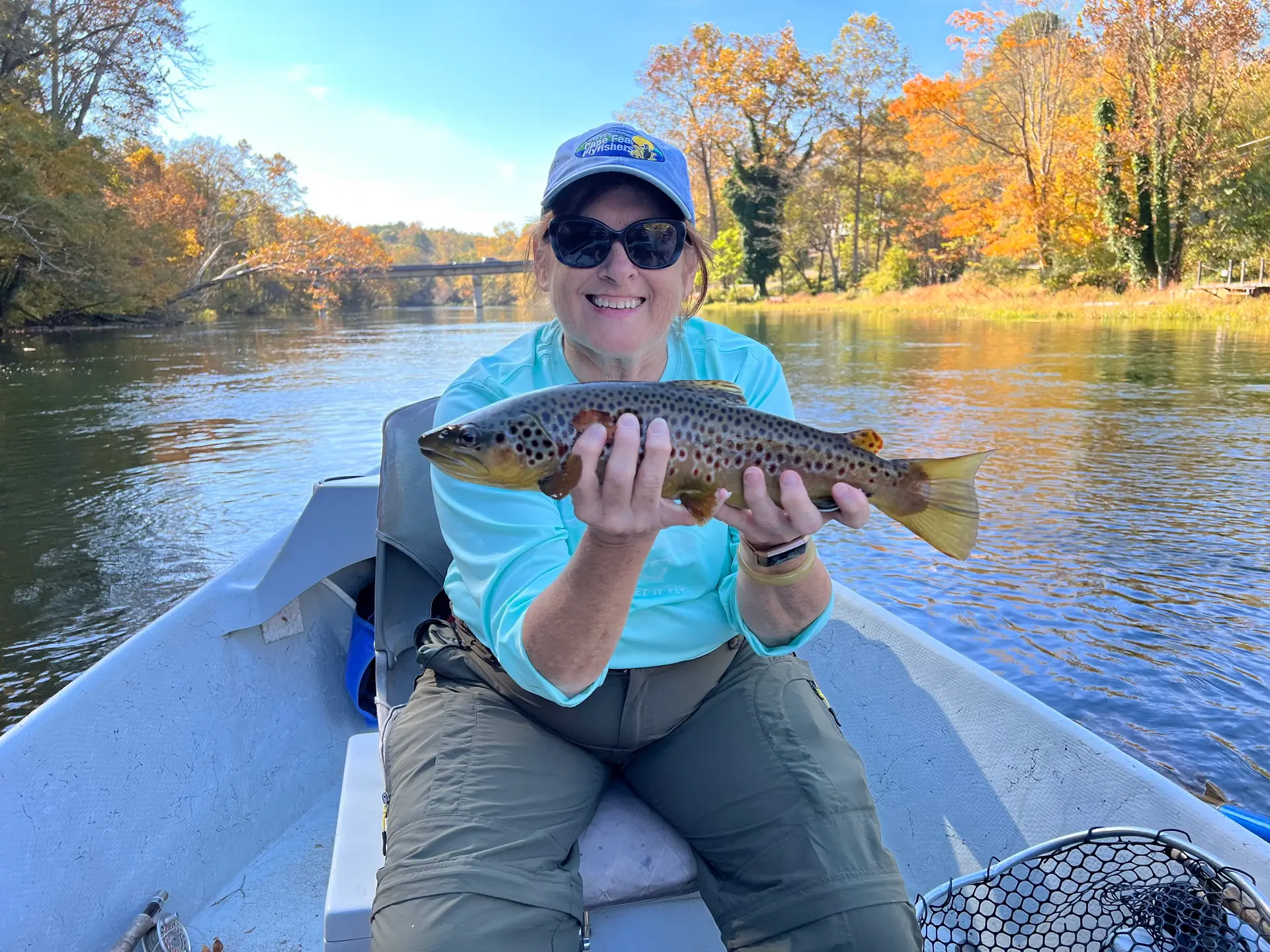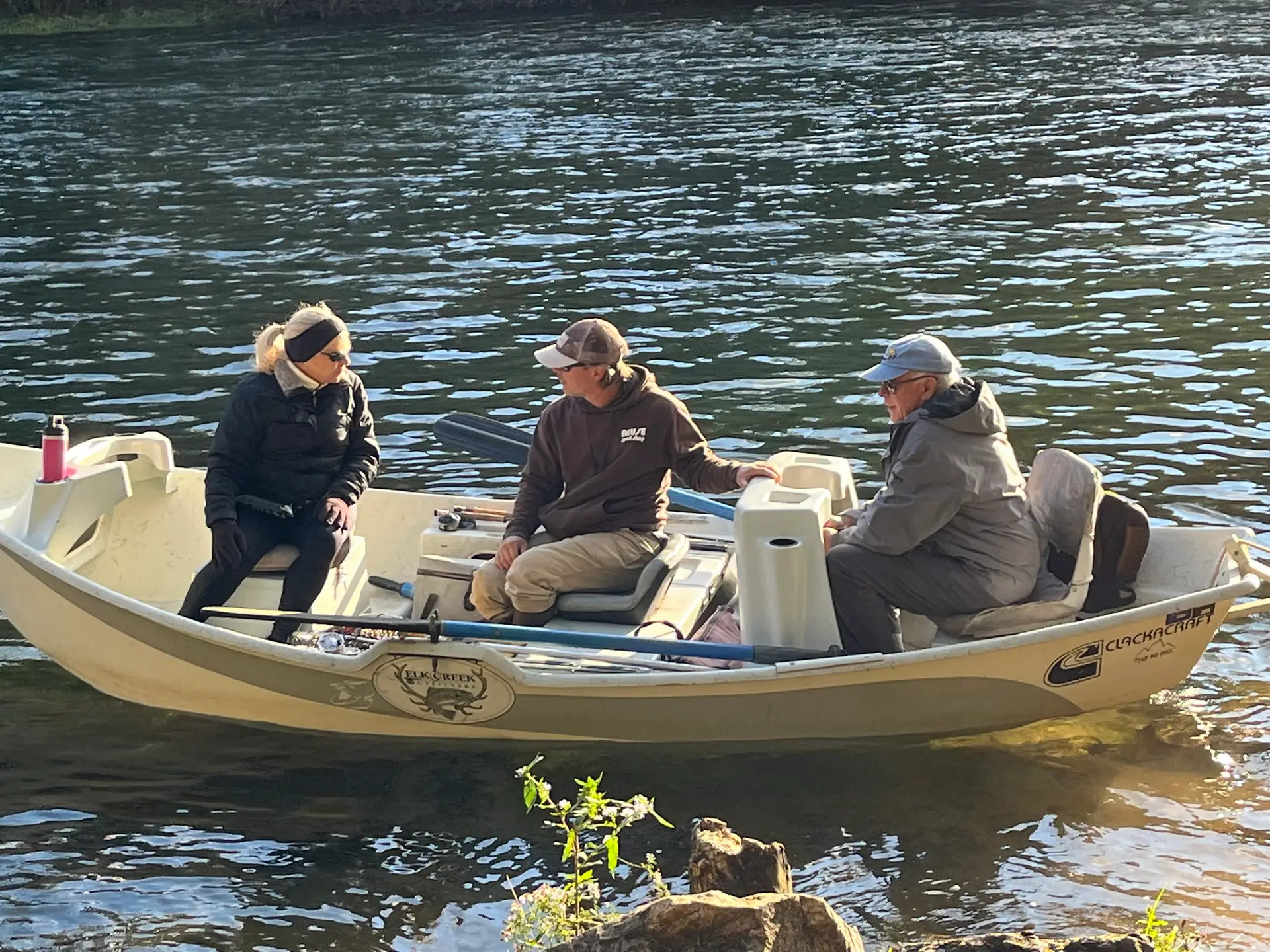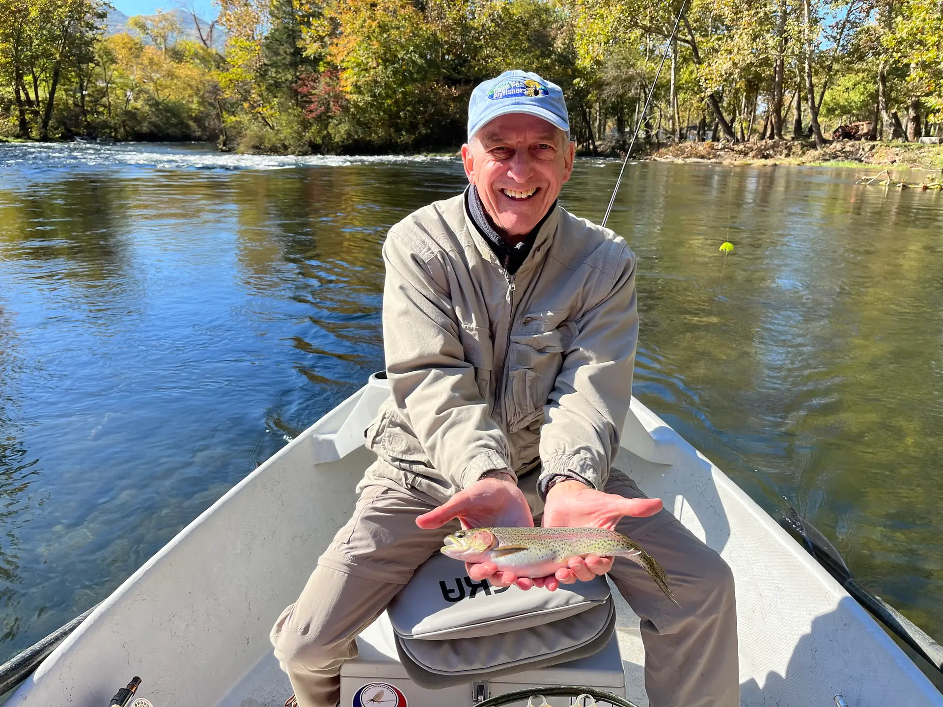 Elk Creek Outfitters provided the guides, boats and equipment. We used a line with double nymphs, the larger point nymph to get the trout’s attention and go for the trailing nymph. In this case we used midges of various colors to match the hatch. The guides were constantly changing midge colors, adding weights, and changing the height of the indicator yarn as the river depth varied. And, of course, they dealt with many of us tangling the long very light leaders. The wind on the first day made the casting of the light long rigging a challenge.