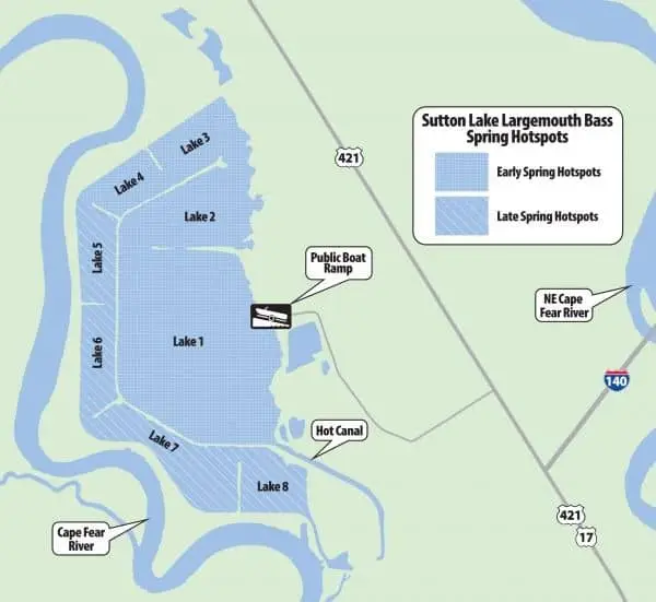 Lake Sutton waters are between 6 and 40 feet deep. The better fishing is in the deeper water. The best time of day is 11:00 a.m. to 3:00 p.m. Start fishing in the first lake — go from the launch ramp to the middle of the lake towards the Hot Canal (see map) to begin fishing. You’ll be in about 6.5′ of water.” Avoid weekends because of the larger crowds.